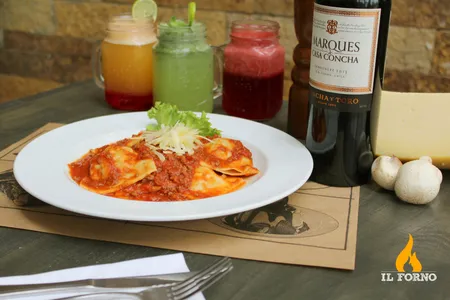 Pasta al huevo rellena con filete de res y ricotta, preparados con la tradicional salsa bolognesa y un toque de queso parmesano